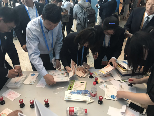 一帶一路高峰論壇,郵政服務區的首日封和集郵冊成為搶手貨,每人限購五套首日封,大家拿到手後,紛紛去蓋紀念郵章。