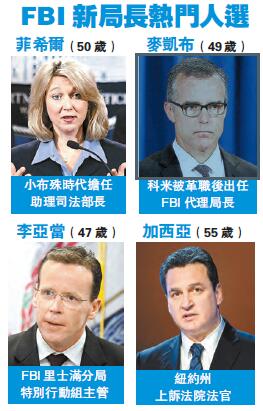 白宮消息指,特朗普正考慮多達11名的人選,包括科米被革職後出任FBI代理局長的麥凱布、德州參議員科寧、紐約州上訴法院法官加西亞、前總統小布殊執政時擔任助理司法部長的菲希爾,及擔任FBI裏士滿分局特別行動組主管逾3年的李亞當。特朗普決定人選後,需要獲參議院通過提名。