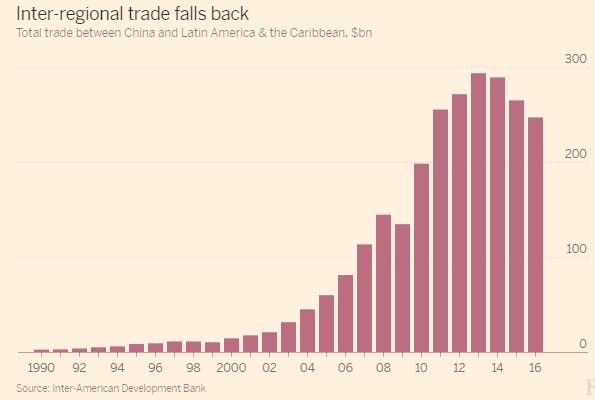 對拉丁美洲出口商來說,中國倡導全球化應該是利好消息。自本世紀初以來,拉丁美洲和這個亞洲大國之間的貿易迅猛增長。但據美洲開發銀行(Inter-American Development Bank,簡稱IDB)表示,貿易增長已陷入停滯,這不僅僅是因為大宗商品泡沫破裂。中國和拉丁美洲雙方的高關稅和其他障礙表明,高唱自由貿易的言辭尚未落實到行動上。