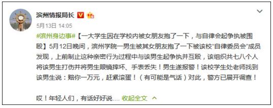 不过,关于@滨州情报局长微博提到的“该校学生处老师对涉事情侣中的男生称:赔你一万元,赶紧滚蛋”一说,相关报道、各方说辞中并未出现,校方回应也未提及此事。