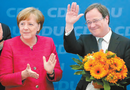 北威州基民盟主席拉舍特(右)在該州的選舉中報捷,使默克爾連任總理的希望大增