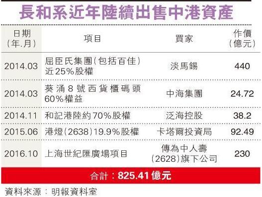李嘉誠過去幾年頻頻出售中港資產惹人注目。最近一次出售紀錄就是去年以230億元作價,出售上海世紀匯廣場項目,傳買家為中國人壽(2628)旗下子公司。此外,長和系近年亦陸續出售包括港燈(2638)、葵涌碼頭及屈臣氏等部分股權,過去9年間長和系售出的內地及香港資產僅披露項目就已近千億元。