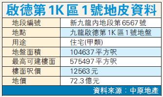 【香港商報訊】記者莊海源報道:中資在啟德住宅地再下一城。地政總署公布,九龍啟德第1K區1號地盤住宅用地,以72.3億元批予合景泰富(1813)及龍湖地產(960),每呎樓面地價為12563元,符合市場預期。該地皮地盤佔地約10.46萬方呎,可建樓面約57.55萬方呎,市場估值約63.3億至74.81億元,每方呎樓面地價約1.1萬至1.3萬元。