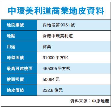 据香港01报道,中環美利道商業地獲本港四大發展商之一的恒地,以逾232億元擊退七家中、港財團奪得,每呎樓面地價逾5萬元,登上全港最貴地王寶座。