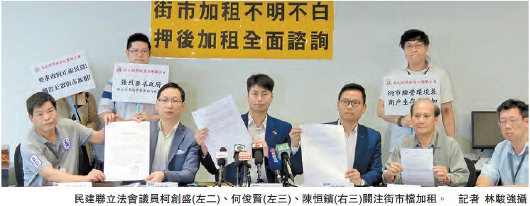 民建聯3位立法會議員包括:九龍東議員柯創盛、新界西議員陳恒鑌、漁農界議員何俊賢,昨日代表黨方舉行記者會,關注本港街市加租情況。議員認為街市租金政策的調整,對於基層市民及小商販有重大影響,政府在未有諮詢持份者下單方面加租的做法不妥。