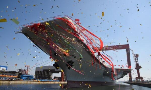 4月26日上午,中国首艘國產航母船塢下水瞬間,可見巨艦下水的壯觀場面。