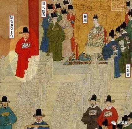 皇帝升殿图。着甲胄者为锦衣卫校尉,左右两侧着大红服者为锦衣卫千户。