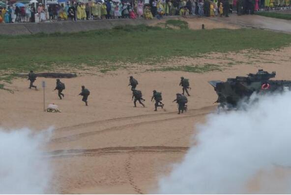 報道稱,這次預演在澎湖馬公海灘進行,整個沙堤上吸引滿滿的民眾和游客,“在雨中近距離觀賞三軍猶如實戰的演習,并給予參演官兵加油,演訓后并開放參觀”。