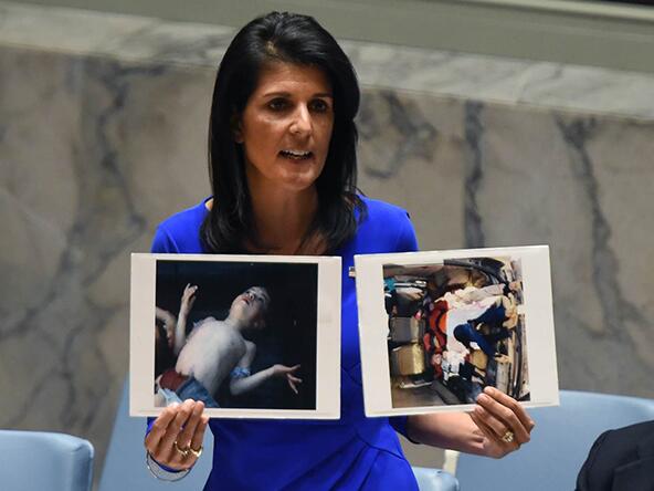 資料圖:尼基·黑利在聯合國展示“敘利亞政府使用化學武器”的證據