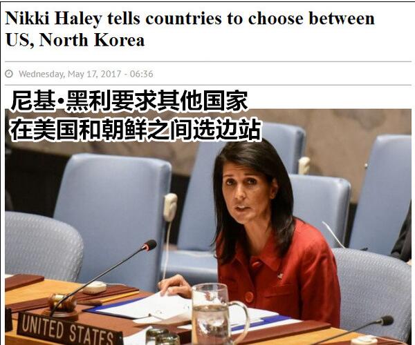路透社相關報道稱,黑利還發誓,美國將“點名”(call out)某些支持朝鮮的國家。她說,其他國家必須作出選擇,是支持朝鮮,還是那些反對朝鮮核導項目的國家。
