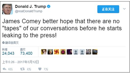 特朗普曾推特稱:科米向媒體爆料前,最好希望沒啥錄音。