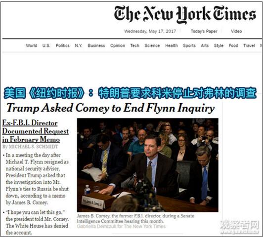 美國《紐約時報》此前爆料稱,今年2月13日,弗林因 “通俄” 辭職;第二天(14日),FBI前局長科米(James Comey)在白宮與特朗普會面;會面結束后,科米立即寫了一份會議備忘錄,詳細記錄了此次會面情況,以及特朗普的要求,并共享給FBI其他高級官員和助手。