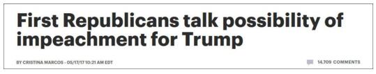 即使是共和黨內部也出現調查特朗普的聲浪,共和黨籍眾院監督委員會主席查飛茲也函請FBI代局長,交出科米和特朗普之間所有談話紀錄,包括備忘錄、筆記、摘要和錄音,共和黨籍參院軍事委員會主席麥凱恩甚至表示,事件已發展到“水門案的規模”。