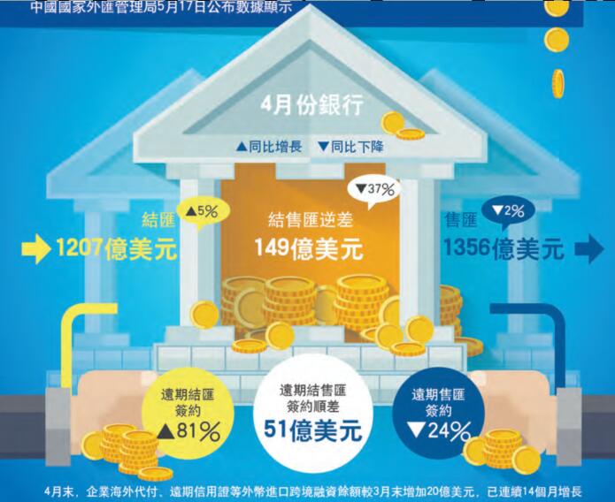 【香港商报网讯】國家外匯管理局昨日公布的數據顯示,今年4月份,銀行結匯同比增長5%,售匯下降2%,結售匯逆差149億美元,同比下降37%;遠期結匯簽約同比增長81%,遠期售匯簽約下降24%,遠期結售匯簽約順差51億美元,上年同期為逆差13億美元。受訪專家認為,4月份中國跨境資金流動延續回穩向好勢頭,主要與貨幣管理、貨幣的趨勢、企業實體發展狀態等因素有關,表明市場對外匯的需求逐漸回歸理性,未來跨境資金流動料仍會平穩。香港商報記者朱輝豪實習記者施美