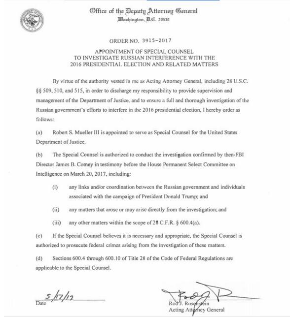 據CNN披露的一份任命文件顯示,作為特別檢察官,穆勒的任務是調查俄羅斯政府或個人與唐納德·特朗普總統競選可能存在的一切聯系和(或)協調行為,調查過程中出現的任何事件,以及司法部規定范圍的任何涉及特別檢察官任命的事項。此外,在適當并必要的情況下,穆勒可以起訴在調查中出現的聯邦犯罪行為。