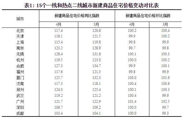 “4月份,因地制宜、因城施策的房地產調控政策繼續發揮作用。”國家統計局城市司高級統計師劉建偉說,從同比看,15個城市新建商品住宅價格漲幅均比上月回落,回落幅度在0.7至7.4個百分點之間。從環比看,9個城市新建商品住宅價格下降或持平;5個城市漲幅回落,回落幅度在0.2至1.1個百分點之間。