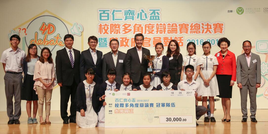 百仁齊心盃校際辯論賽總決賽,行政長官梁振英與一眾嘉賓和獲獎同學合照。