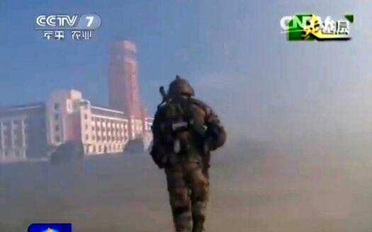 央視視頻畫面,注意“跨越-2015·朱日和C”演習中出現的紅色5層建筑物
