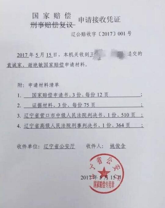5月15日,遼寧省公安廳出具《國家賠償申請接收憑證》,表示已經收到袁誠家夫婦的國家賠償申請材料,其中包括12頁的賠償申請書,75頁的證據材料,以及共計874頁的一二審判決,該憑證落款加蓋了“遼寧省公安廳國家賠償專用章”。