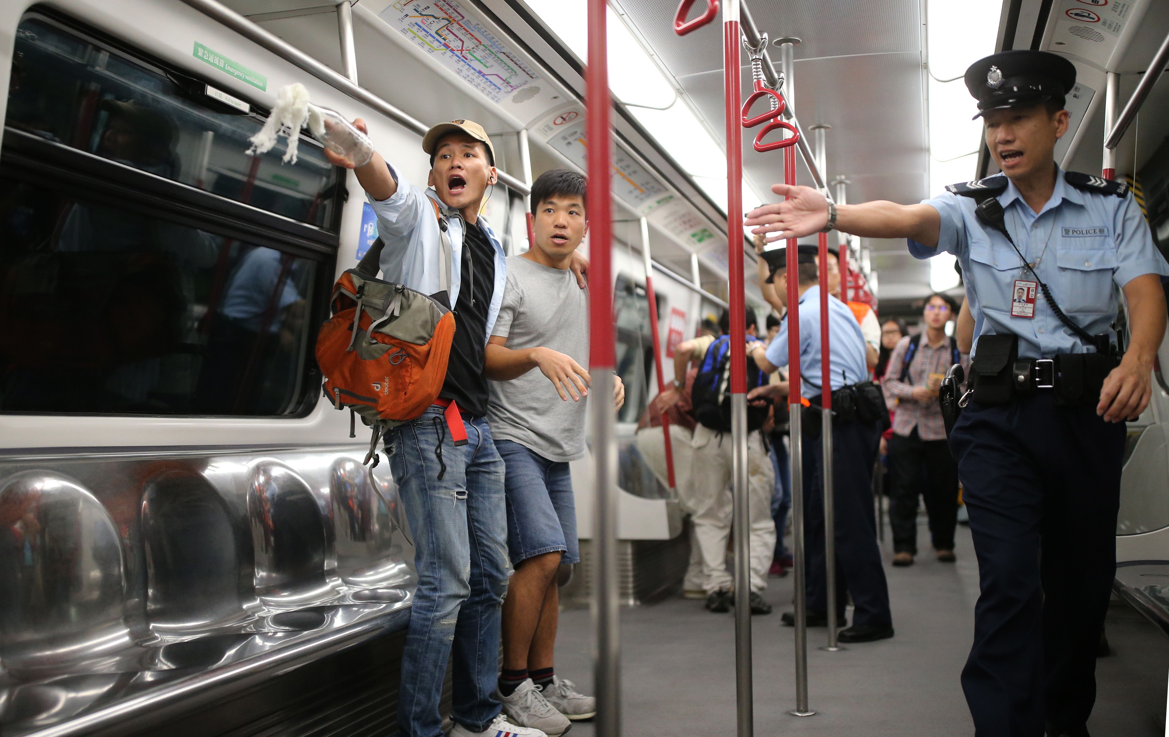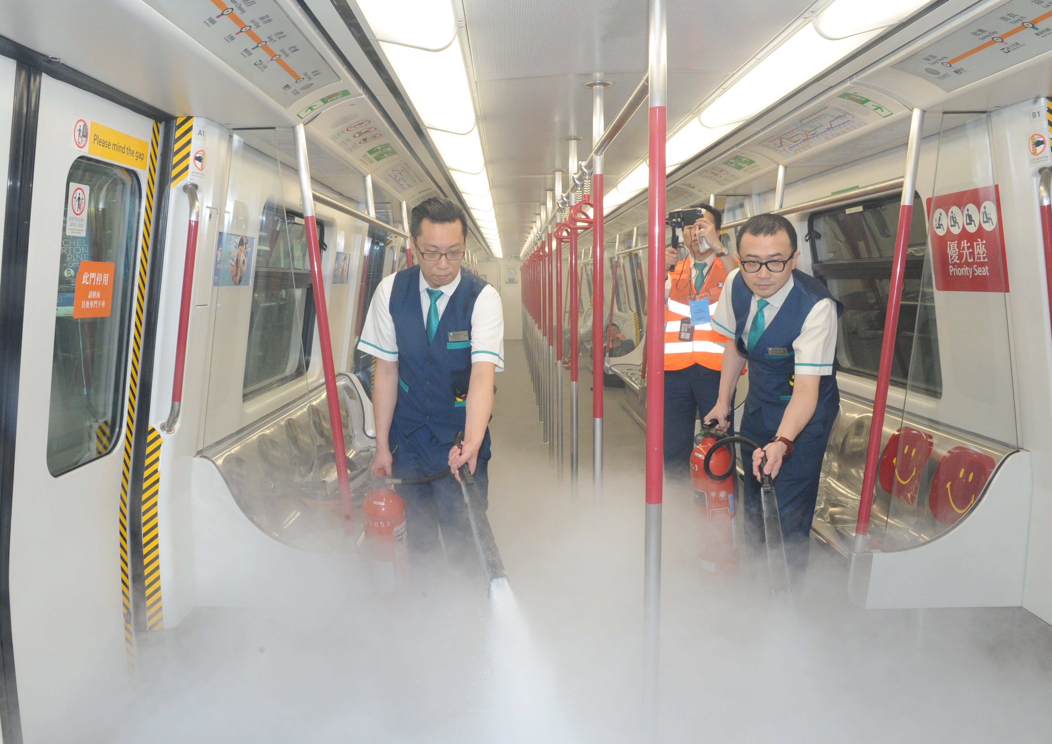 港铁职员演习示范在地铁列车内救火。