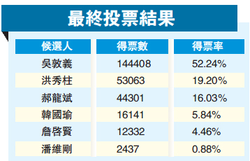 【香港商報網訊】中國國民黨主席選舉昨天進行,據國民黨中央開票結果,候選人吳敦義得票14萬4408票,得票率52.24%,首輪即過半,成功當選黨主席。確認當選后,吳敦義發表感言,表示2020年台灣地區領導人選舉要提早準備,國民黨如果重新「執政」,一定尊重一中各表的「九二共識」,確保兩岸和平發展。
