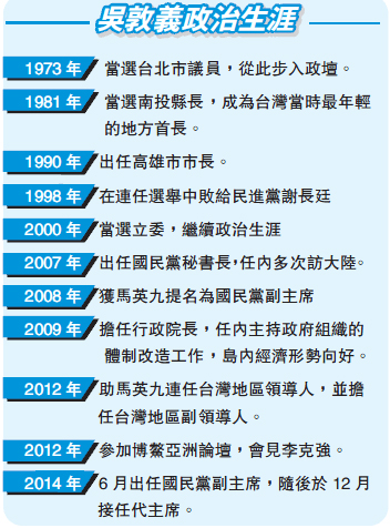 卸任南投縣長后,吳敦義歷任國民黨台北市黨部主委、高雄市長、國民黨中常委、國民黨副主席兼秘書長、國民黨立委、「行政院長」、台灣地區前副領導人,黨政資歷豐富且完整。