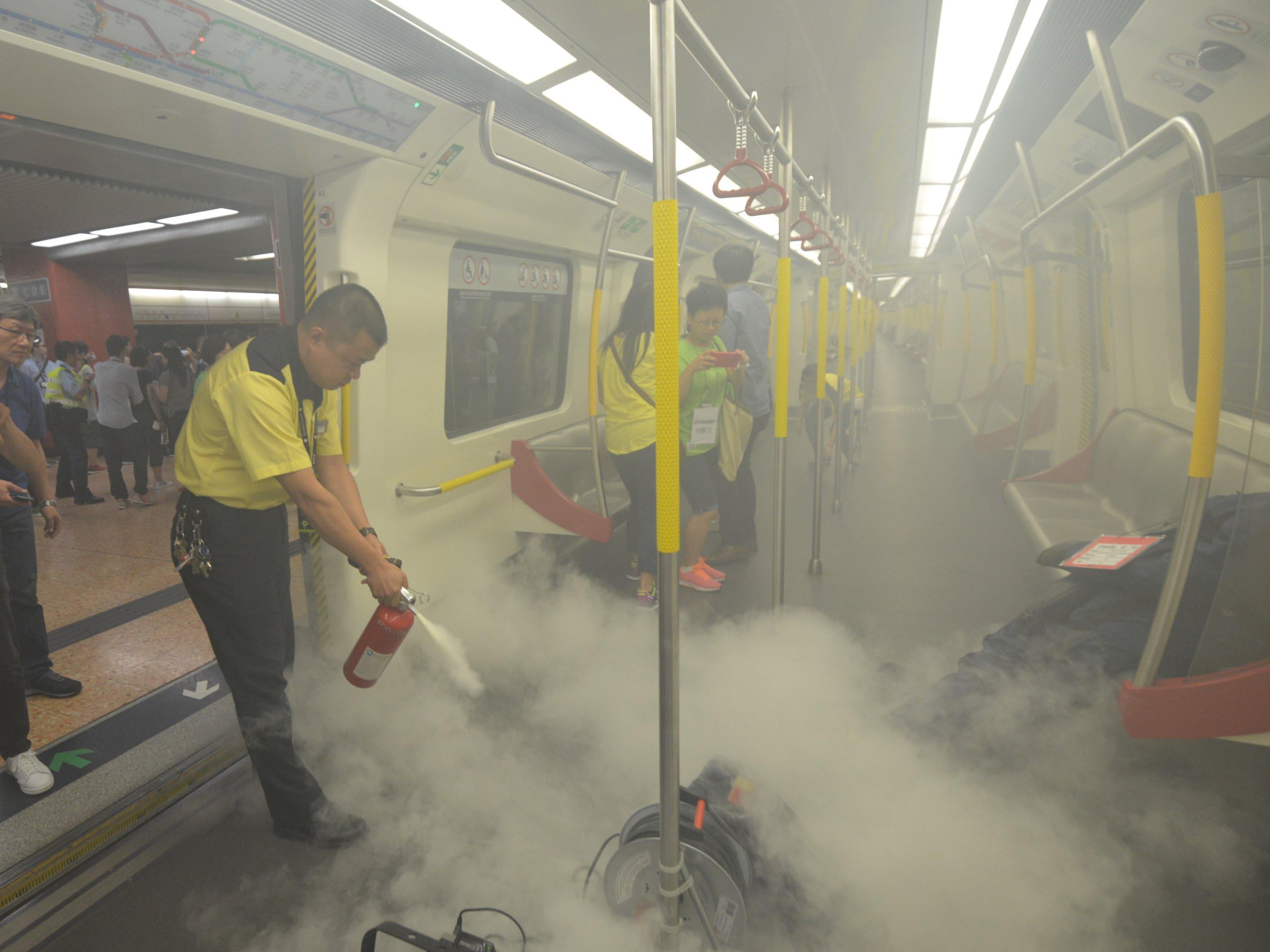 演習由港鐵、消防處、警務處及1000名公眾人士參與,昨凌晨模擬一列開往黃埔方向的觀塘線列車,有乘客攜帶的背囊起火冒烟,濃烟蔓延至其他車廂,車長按程序通知車務控制中心,并繼續將列車駛至旺角站,職員迅速救火并疏散旺角站內千名乘客,用滅火筒將列車上的火警救熄,救護人員亦在車站內設置臨時分流站,確保「受傷乘客」在送院前得到及時治理。