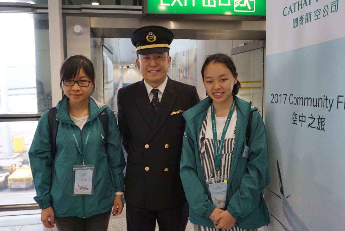 寶血會上智英文書院中五梁穎欣(左)与聖公會基榮小學6年班張燁婷(右)跟「香港起飞」機師郑楚衡合照。