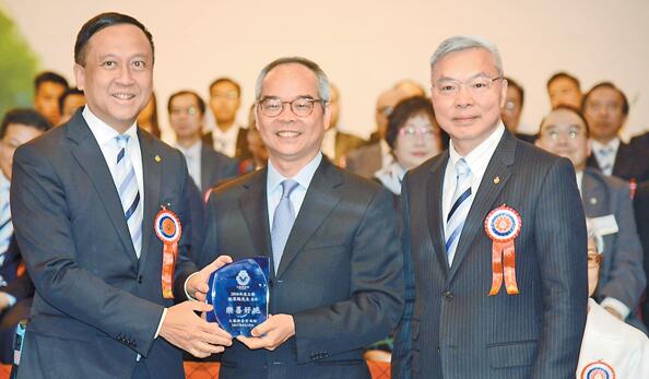 郭予宏(右)陪同劉江華(中)致送紀念品予施家殷。