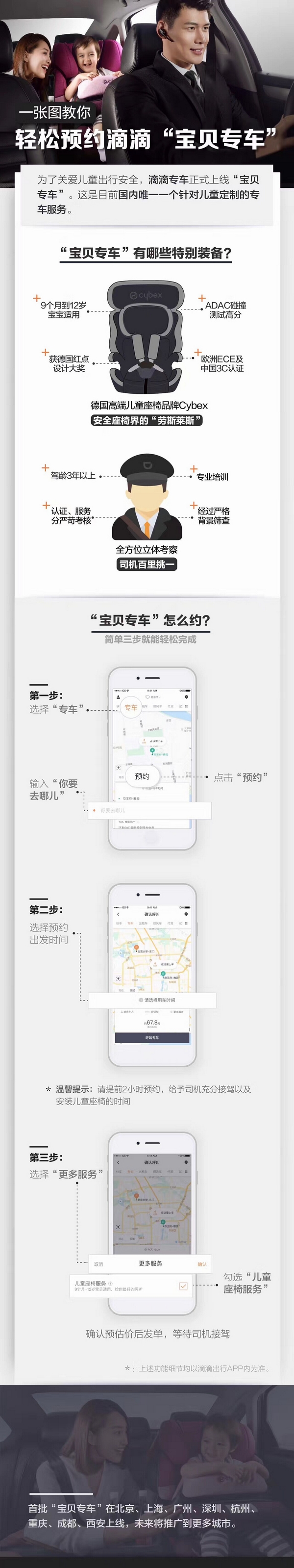 “基于满足用户需求,保障儿童出行安全的初衷,我们专门推出了宝贝专车这一定制服务。”滴滴品质出行事业部付强表示。
