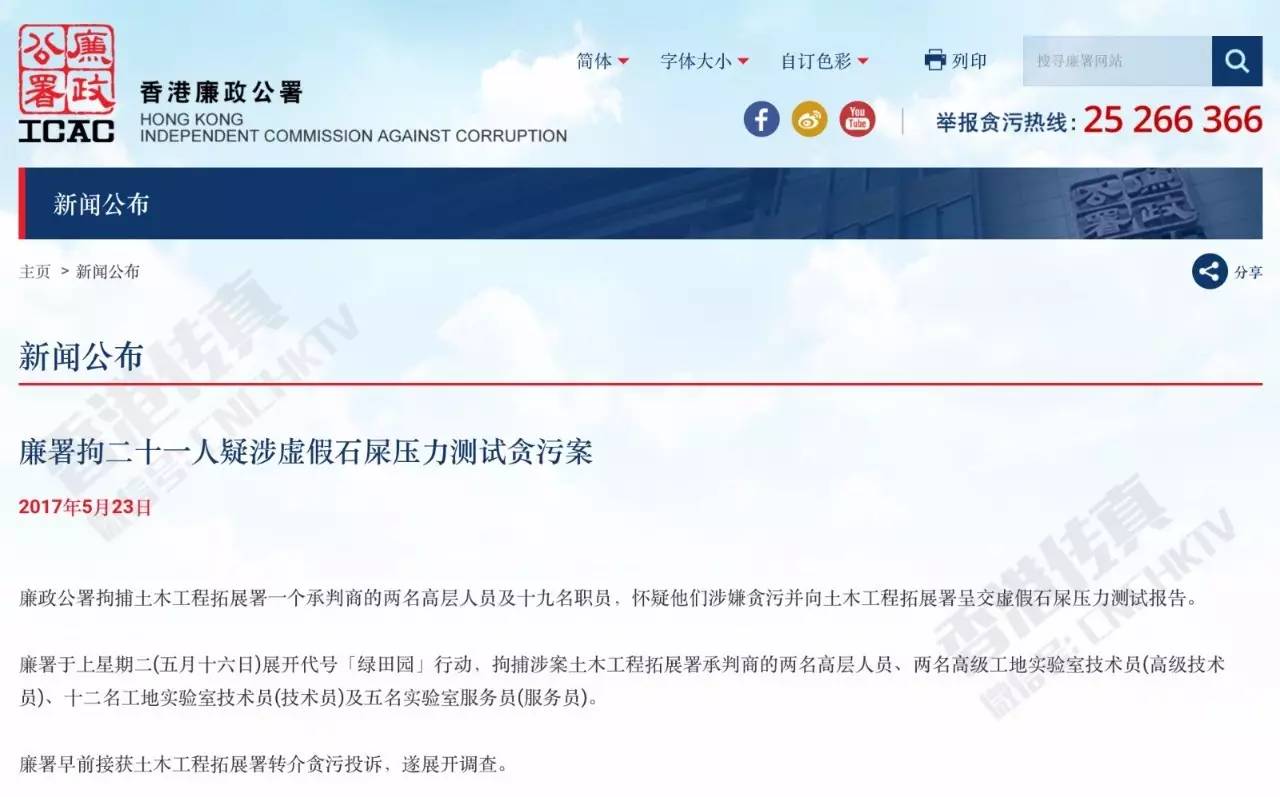另外,部分實驗室人員在2015年開始涉嫌以金屬校準柱、或強力石屎磚代替石屎樣本,以偽造測試結果。至上周二(16日),廉署展開代號「綠田園」行動,先后拘捕涉案21人。