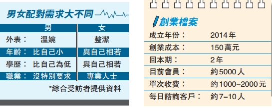 巫寶珠坦言,一對一配對服務較「極速約會」收費為貴,每次一對一約會服務收費介乎1000至2000元左右,但針對性相對較高,亦可盡量避免出現期望與現實南轅北轍的尷尬情況出現。她提到,現時免費手機婚姻中介應用程式流行,惟網上的安全問題成疑,公司的會員身份、年齡及收入等等全部經過核實,服務安全可靠,而電腦配對服務始終難以取代人手的細心。