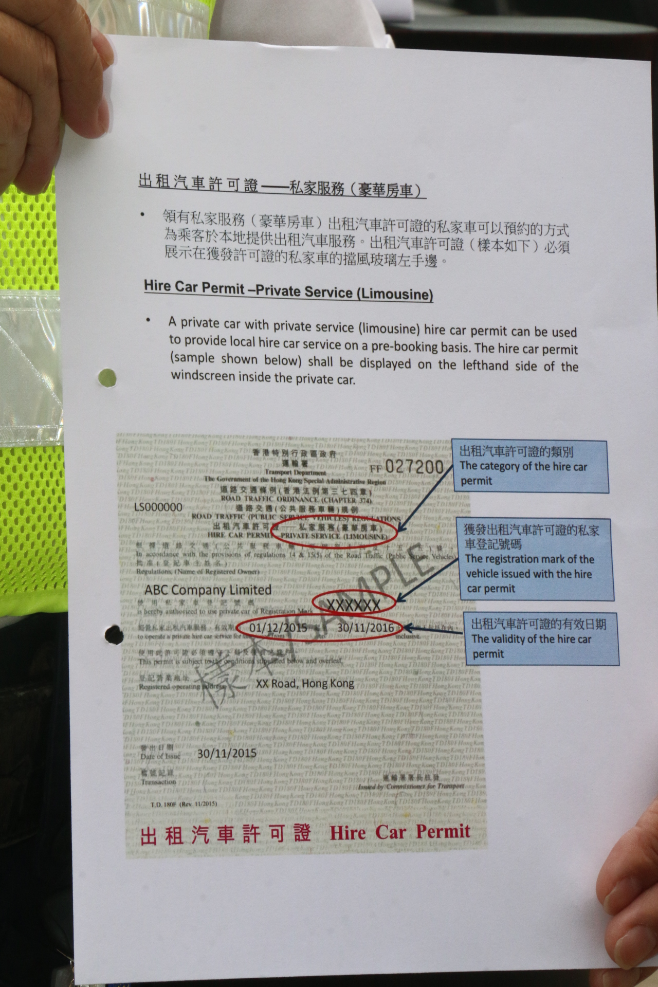 根據《道路交通條例》第374章第52條3款的規定,任何人不得駕駛或使用汽車以作出租或取酬載客用途,除非該車輛領有生效的出租汽車許可證。根據《汽車保險第三者風險條例》第272章第4條1款的規定,任何人在道路上使用汽車,除非就該人或該其他人對車輛的使用已備有一份有效和符合本條例規定的第三者風險保險單或保證單,否則并不合法。