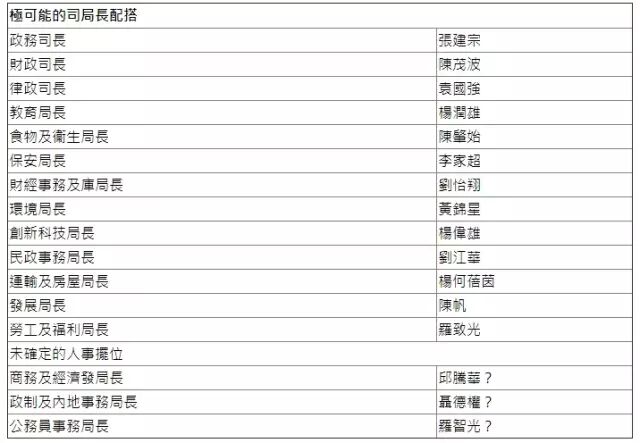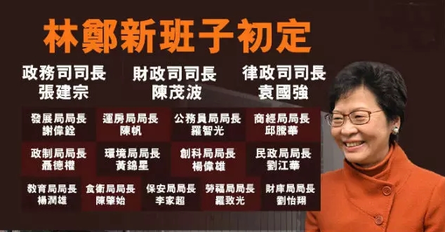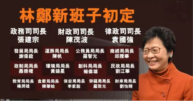在上述位置的摆位确定后,林郑的新班子组班工作已大致完成,其他留任的还有环境局局长黄锦星、创科局局长杨伟雄、民政事务局局长刘江华;由副局长升任局长的则有教育局局长杨润雄、食卫局局长陈肇始、保安局局长李家超及财经事务及库务局局长刘怡翔;至于外来的新局长则是劳福局局长罗致光。