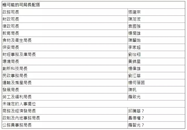 据巴士的报报道,前建筑测量界立法会议员谢伟铨将出任发展局局长,机电工程署署长陈帆则升任运输房屋局局长,而保安局常任秘书长罗智光将出任公务员事务局局长。
