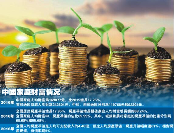 在中國家庭財富方面,昨天發布的另一份報告——《中國家庭財富調查報告(2017)》指出,2016年我國家庭人均財富為169077元,與2015年相比,增長幅度為17.25%,其中城鄉差异較為明顯。此外,家庭財富也存在著一定地區差异,東部地區家庭人均財富水平最高,中部地區次之,西部地區最低。從數值上看,東部地區家庭人均財富為242604元,中部、西部地區分別為119768元和92304元,東部地區家庭人均財富分別是中部、西部地區的2.03倍和2.63倍。