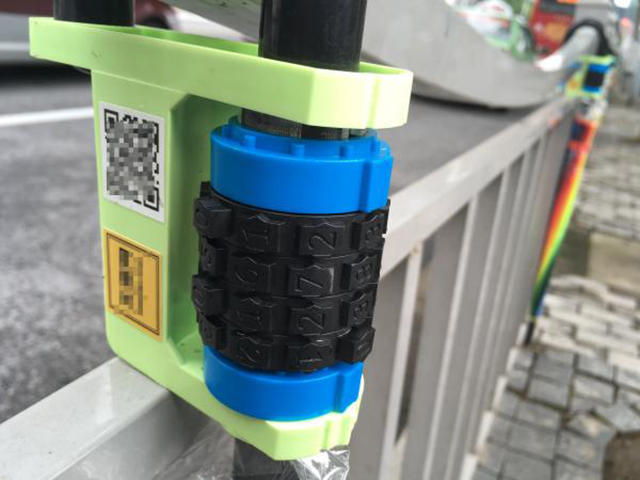 前一處投放點共有18把共享雨傘掛在人行道等市政設施上。這些雨傘由一層透明塑料套著,把手處還有一個二維碼供用戶掃描。記者掃描二維碼後,系統提示,用戶想使用共享雨傘,要先下載App或者關注微信公眾號。澎湃新聞記者體驗發現,使用前無需實名認證,只需支付20元的押金。在確認下單前,系統提示收費標准為1元/天。獲取密碼後,記者轉動密碼盤取出雨傘。除去繳納押金的時間,整個取傘過程不到1分鍾。