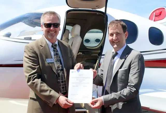 22日在瑞士日內瓦舉辦的歐洲公務航空會議及展覽會(EBACE)的發布會上,EASA適航代表Steve Higgins向西銳公司聯合創始人兼首席執行官Dale Klapmeier頒發了適航證書。