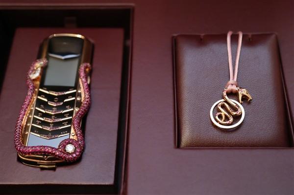 什么手機能賣這么貴?據了解,SIGNATURE眼鏡蛇限量版由VERTU與法國皇室珠寶品牌寶詩龍聯合推出,以VERTU SIGNATURE為基礎,融合寶詩龍的寶石切割和鑲嵌工藝。