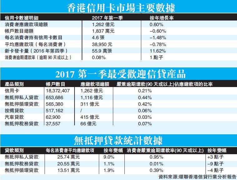 本港信貸產品眾多,當中包括汽車貸款、按揭、無抵押私人貸款、無抵押稅務貸款及無抵押循環貸款等。雖然信用卡是大眾比較喜歡的信貸產品,但環聯報告分析,2016年第一季至2017年第一季期間,持有信用卡的消費者數目僅輕微上升0.9%,反而無抵押私人貸款與無抵押循環貸款漸漸成為受港人歡迎的信貸產品。香港商報記者 李映萱