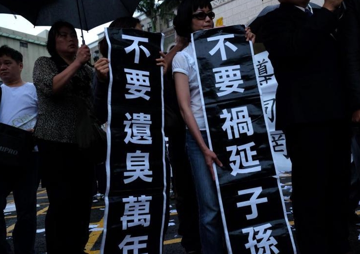 反对同性婚姻的民众在司法院门口高声抗议“程序不公,释宪无效”。(法新社)