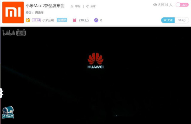 騰訊科技訊 5月26日消息,小米Max2發布會於昨天下午舉行,然而讓人大為意外的是,在發布會的視頻直播中,居然出現了長達近2分鍾的華為Logo,一時間場面非常尷尬,不過官方很快恢複了信號源。一時不少米粉以為小米發布會被華為“黑了”。