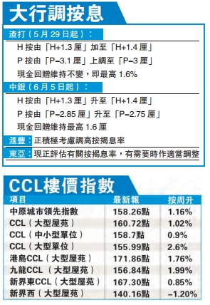 中銀香港亦宣布於6月5日起,上調H按及P按息率。H按由「H+1.3厘」升至「H+1.4厘」;P按由「P-2.85厘」升至「P-2.75厘」;現金回贈維持最高1.6厘。中銀香港個人金融及財富管理部抵押及零售貸款業務處主管陳碧蓮表示,適時調整息率可審慎管理風險,不排除未來再作調整。汇豐銀行發言人則指,正積極考慮調高按息。