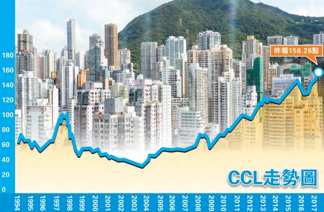 九龍區及新界東CCL創新高。九龍CCL最新報156.84點,按周升1.99%;新界東CCL最新報167.3點,按周升0.85%。新界西CCL則連跌兩周,最新報140.16點,按周跌1.20%,為歷史第三高。