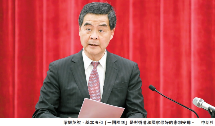 梁振英最后說,基本法和「一國兩制」是對香港和國家最好的憲制安排。香港會繼續按照基本法的規定,以及「國家所需,香港所長」的方針,用好「一國兩制」的雙重優勢,掌握國家發展機遇,推動自身發展,為國家建設貢獻力量。
