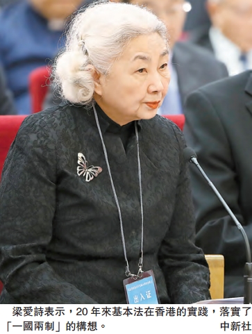 【香港商報网訊】全國人大常委會香港基本法委員會副主任梁愛詩昨日表示,20年來基本法在香港的實踐,落實了「一國兩制」的構想,打穩了中央和香港的關系,明確了特區的法律地位,符合保持香港繁榮穩定的目的。