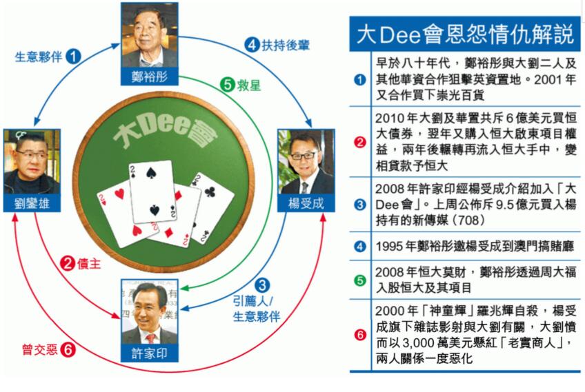 2008年许老板第一次在香港上市失败,资金差点周转不开的时候,杨受成把他介绍给了周大福的郑裕彤,小许每周都来香港陪郑老爷打牌,最终获得彤叔赏识和财力支持,渡过集团难关;