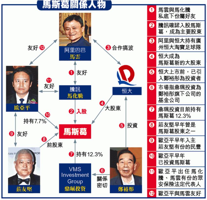 时隔一年,许老板拉着小马哥闪亮登场了,他俩分别花了5.4亿及1.97亿买下超过马斯葛逾70%的权益,每股作价6分钱,较停牌前0.285元大幅折让近98%,停牌前公司市值是102.5亿。