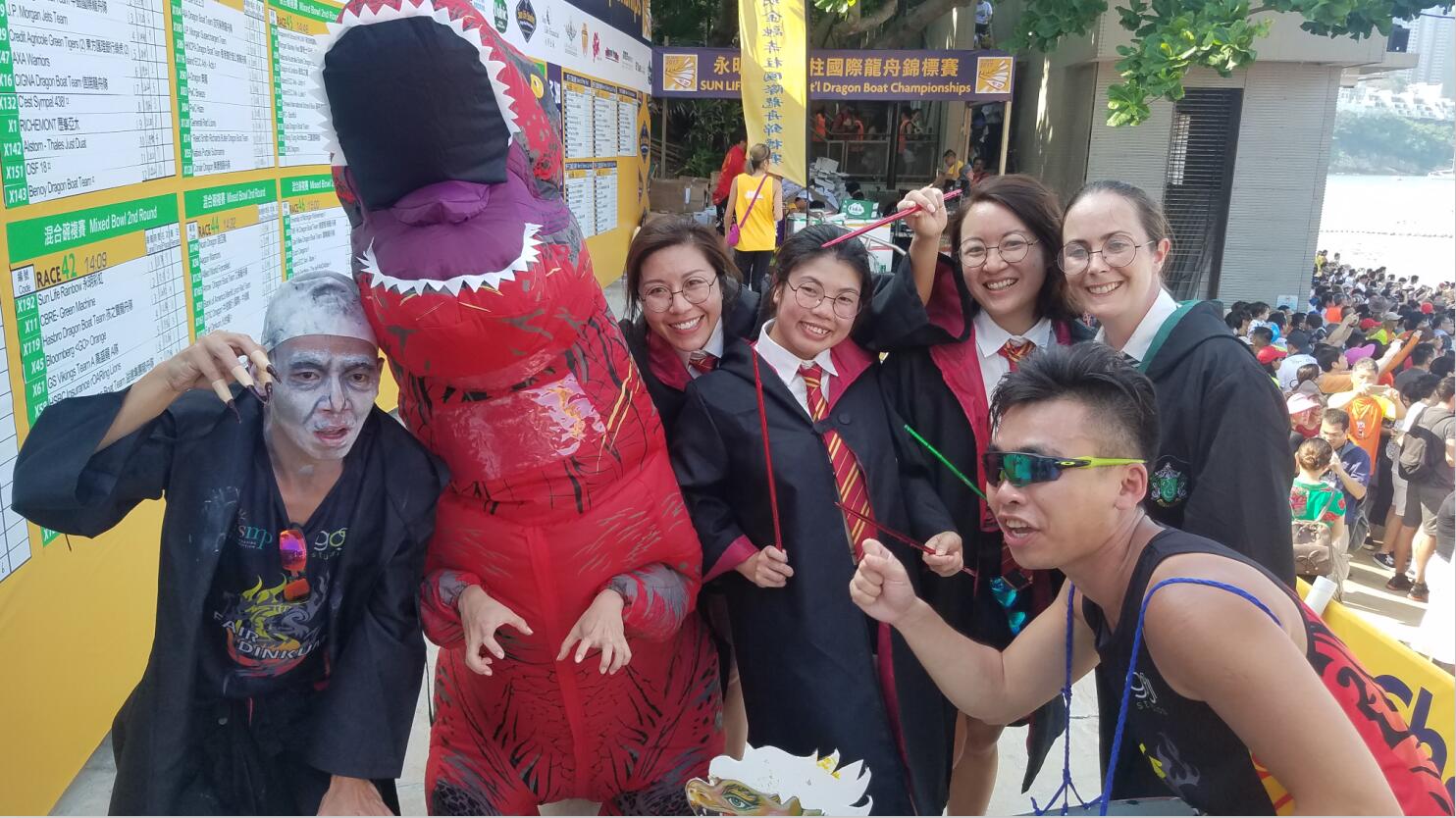 除了激烈的龍舟賽事外,「最搶鏡服飾獎」也是其中一項「吸睛項目」,今年共有9隊參與,分別扮演「Where's Wally」、「哈利波特」、「變形金剛」、「水手裝」等造型,令現場氣氛進一步推升。而獲得亞軍的是扮演「哈利波特」的「火的龍」隊伍,其代表陳是弘表示,已經參加赤柱的比賽10多年,今年選擇此造型是因為這套電影老少咸宜,不論港人或是外國游客也對此非常熟悉。他又說,以往也試過扮不同的造型、卡通人物等,都是希望能帶歡樂給大家,一同慶祝節日。