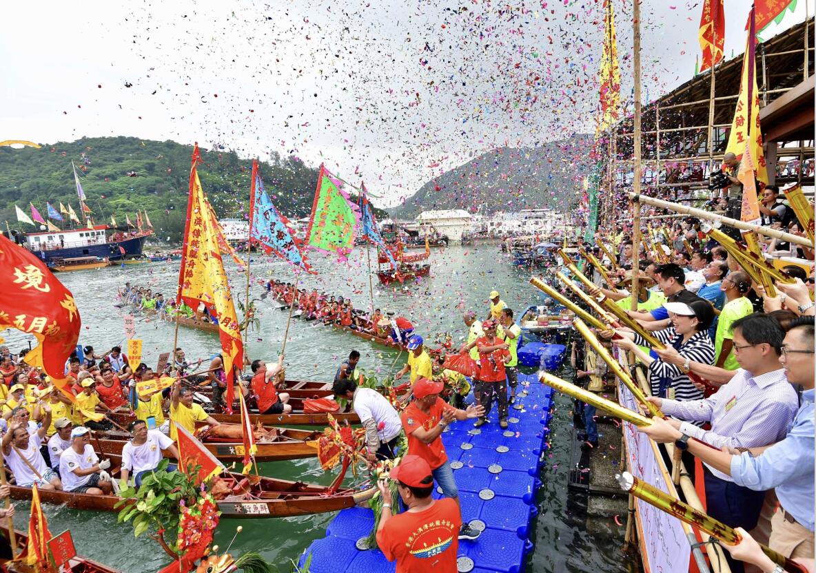 香港仔賽龍壓軸的大龍舟賽事「漁民大龍精英金盃決賽」,由漁業龍奪冠,隊員從主禮嘉賓財政司司長陳茂波手中接過獎盃,全場喝采聲四起。